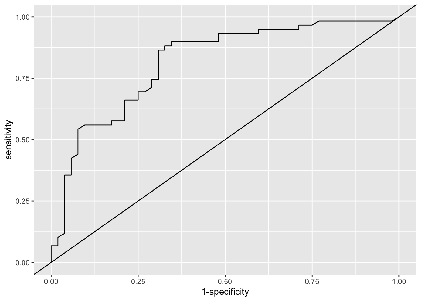 Solution. Firstly we’ll use ROC analysis to assess the model in terms of how well it discriminates the participants in terms of their respiratory status at 4 months.