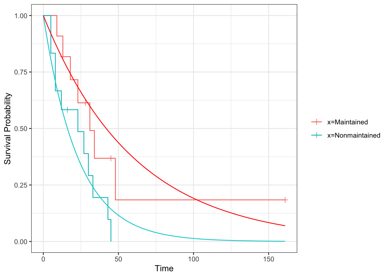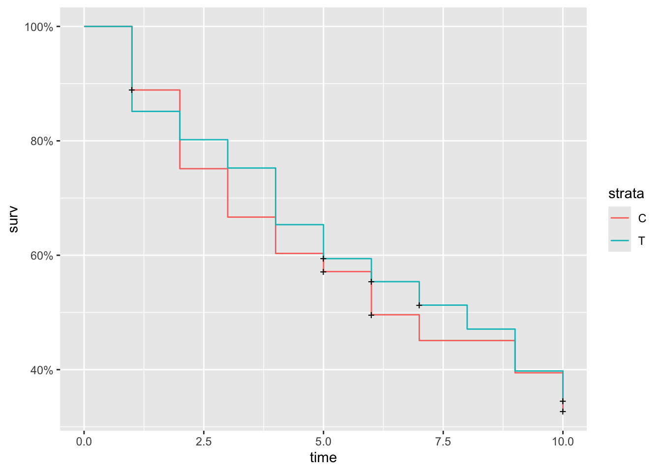 with(data = surv_df1, Surv(time, status, type = "right"))## [1] 3 1 10+ 3 1 10 10+ 10+ 10+ 6 9 6+ 3 2 9 5 1 10+ 2 1 1 10+ 6 1