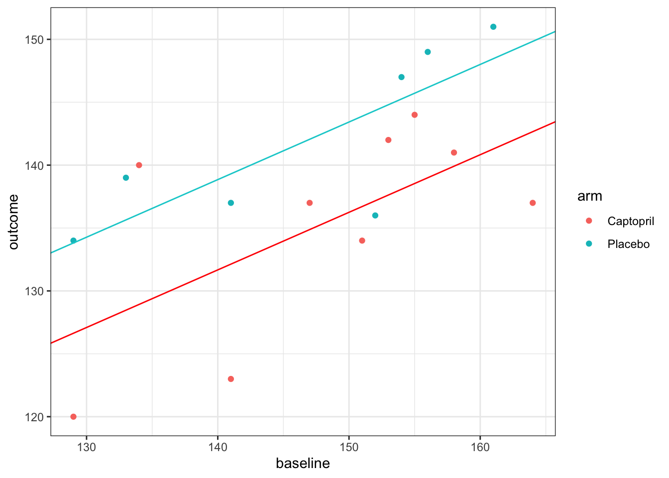 \[ \text{arm}_i = \begin{cases} 0 & \text{ if participant }i\text{ is assigned Captopril}\\ 1 & \text{ if participant }i\text{ is assigned Placebo}. \end{cases} \] Therefore, for a patient assigned Placebo, a value of 7.18 is added, as well as the intercept and baseline term. This results in a model with two parallel fitted lines.