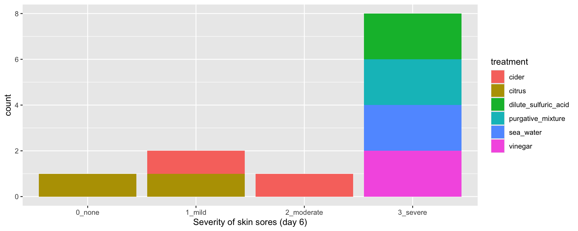Lind chose twelve seamen with similar severity of symptoms, and subjected them to their assigned treatment for 6 days. They were kept in the same quarters, and fed the same diet apart from their treatment. Unsurprisingly (to us!) “The most sudden and visible good effects were perceived from the use of oranges and lemons,”